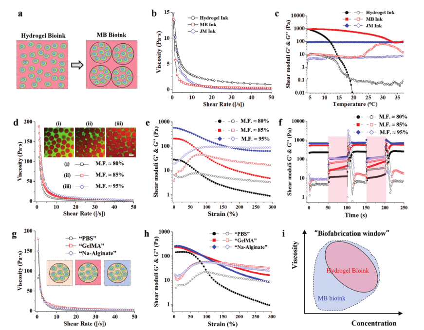 The rheology of bioinks is critical for extrusion bioprinting. We compared the rheological properties of MB bioinks with bulk hydrogels and conventional microgel-based (JM) bioinks. As expected, all ink viscosities decreased with increasing shear rate at room temperature, and the addition of the microgel component increased the viscosity of the MB bioink. Compared with conventional GelMA hydrogel ink, the viscosity of MB bioink is independent of temperature. Using sodium alginate and GelMA as ink precursors, the researchers found that the rheological properties required for extrusion printing depend on the closely packed state of the microgels, independent of the composition of the microgels and the second network.
