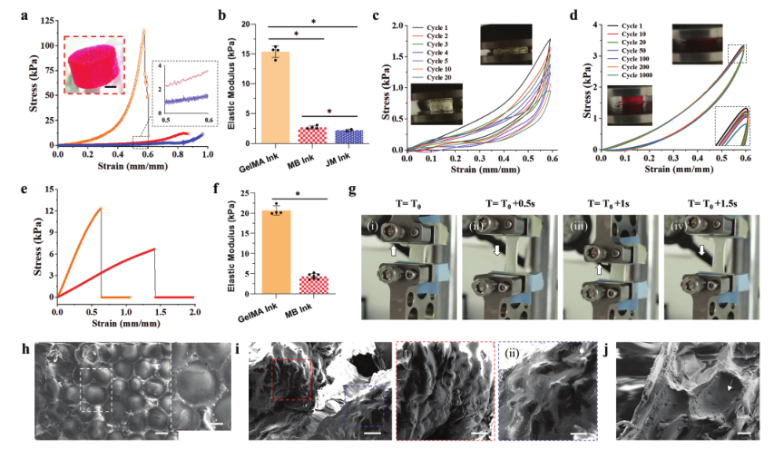 The researchers then compared the mechanical properties of the different inks. Compared with the GelMA bulk hydrogel, the MB bioink and JM bioink exhibited greater elasticity. In addition, for the MB bioink, the microgels exhibited greater elasticity under compressive conditions. is further confined within the second network and thus has a relatively high elastic modulus compared to the JM bioink. MB bioinks exhibit extraordinary structural robustness and cycling performance. (Figure 4)