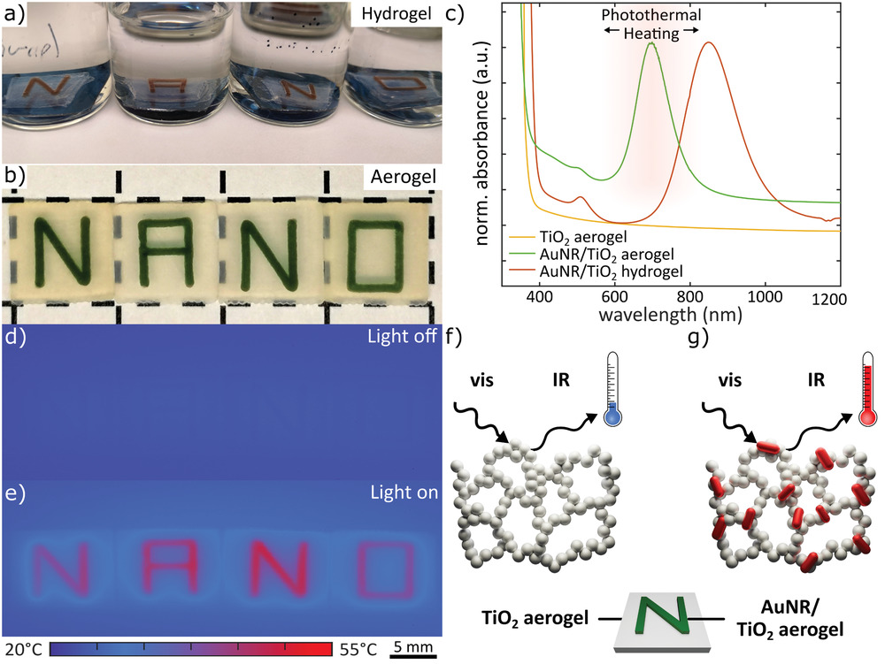 △ Multi-material printing of pure TiO2 and AuNR/TiO2 mixed ink. The AuNR-loaded ink appeared a) reddish in the form of a hydrogel and b) green in the form of an aerogel. c) The UV/Vis absorption spectrum shows that the color change is caused by the blue-shift of the longitudinal plasmon resonance peak, while the dielectric environment is changed from liquid to air by supercritical drying. d,e) Thermal infrared camera images of the structured aerogel when illuminated with the 300 W Xe light source turned off and on, respectively. f,g) Schematic illustration of photothermal heating of TiO and AuNR/TiO aerogels under visible light irradiation. Pure TiO2 aerogels remain low temperature, while AuNR-loaded aerogels heat up due to the strong light absorption of plasmonic AuNRs.