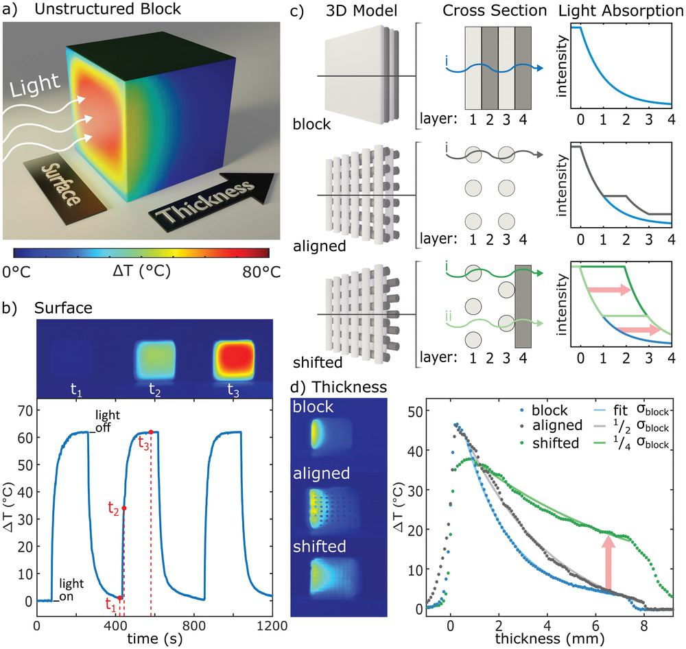 △ Effect of microstructure on temperature and light distribution of 3D printed AuNR/TiO aerogels. a) Schematic diagram of a typical photothermal measurement. The sample is illuminated from one side, while an infrared camera records the temperature of the front or one of the sides. Exemplary temperature data for bulk geometry is shown as a superposition of cubic unstructured samples. b) Temperature-time trajectory of body surface temperature under repeated illumination. The insets show the IR camera images at t1, t2, t3 as shown in the time trace plots. c) Schematic representation of light penetration through three microstructures (unstructured block, aligned and displaced). The 3D model from left to right shows the cross-section and expected light absorption of each geometry. Adjacent layers of geometry are colored for clarity. d) Thickness dependence of the measured temperature distributions for the three microstructures. The bulk temperature distribution is fitted with an exponential function to extract the bulk extinction coefficient σ block. The temperature distributions for the aligned and shifted geometries follow an exponential trend, but with 1/2 or 1/4 of the volume decay constant σblock, respectively.