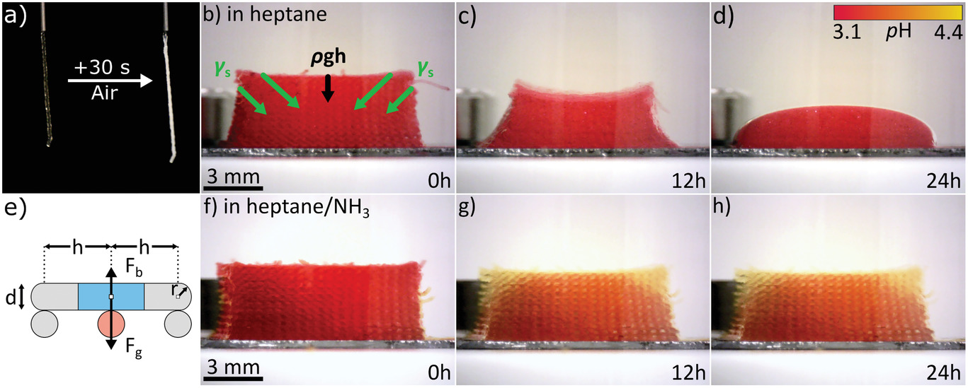 △ The experimental obstacle of TiO 2 nanoparticles-based aerogel DIW. a) Time series of optical micrographs of the to-be-treated TiO gel filaments extruded in air through a nozzle with an inner diameter of 410 μm. Time series of optical micrographs of microgrids 0, 12 and 24 hours after printing in bd) heptane and fh) heptane filled with NH 3 , respectively. e) Schematic diagram of the microgrid printed using nozzles with diameter d = 2r and filament center-to-center distance h. Although (a) all inks were equipped with pH indicators to account for pH-induced TiO condensation gelation. The microgrids in (b,f) were printed with a 250 μm nozzle and consisted of 23 layers, where each layer was an array of parallel filaments with a center-to-center distance h of 500 μm.