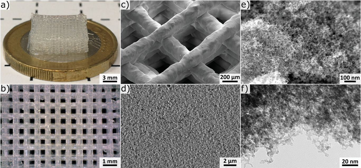 The research team printed geometries with high shape fidelity and precision, including void-free cubes, 3D meshes, boats with large overhangs, and other multi-material geometries. The 3D-printed aerogel contains a randomly organized network of interconnected mesopores with pore sizes in the 20 nm range and has the typical relative surface area and low density of traditional cast metal oxide aerogels.
