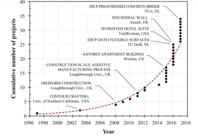 An ever-increasing timeline of projects related to additive manufacturing of cementitious materials since 1997. [5]