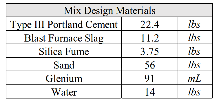 Mixing ratio for standard batch of 0.75 ft3 mortar