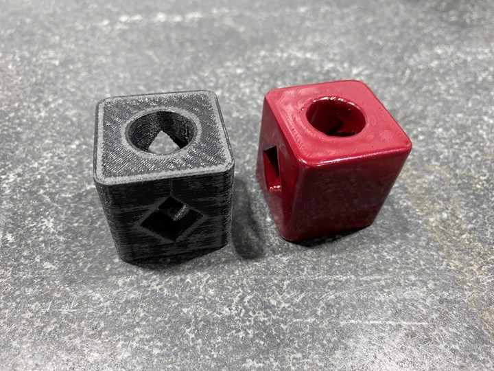 △ 3D printed carbon fiber PEEK parts and 3D printed carbon fiber PEEK parts with powder coating.