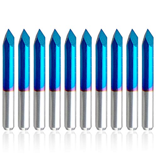 Cutting Edge Size: 0.1mmShank Size: 1/8” (3.175mm)Shape: Triangular V bitDegree: 60 degreeMaterial: High quality steelCoating: Nano blue coating