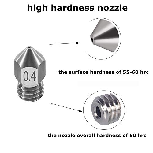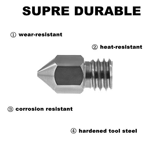 Premium material: Our MK8 extruder nozzles are made of hardened stainless steel, harder than normal brass nozzles,hardened stainless steel material is durable to use for a long time with the good heat resistance and corrosion resistance, abrasion resistance