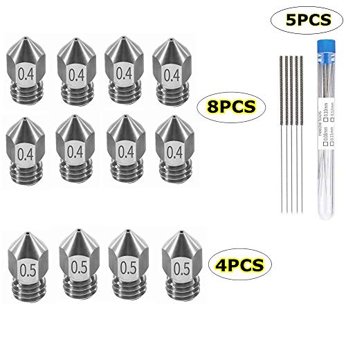 Value for money: package comes with 8*0.4mm ,4*0.5mm hardened steel nozzles ,sufficient quantity to facilitate your timely replacement, achieving quality printing, and 5 x nozzle cleaning needles, which has strong flexibility and durability, easy to bend the needle into a nozzle without breaking, good tools for nozzle clogging clean.