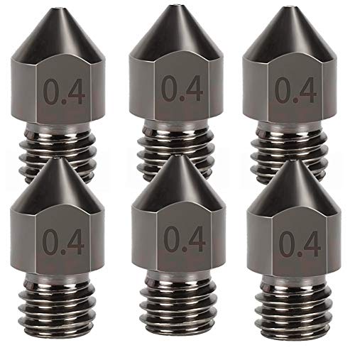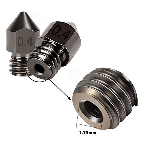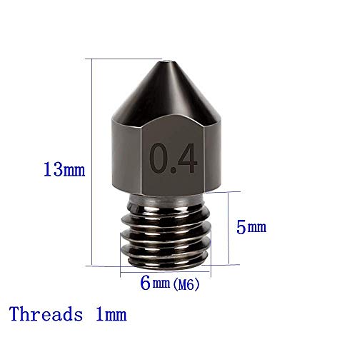 Package :Specification of this black MK8 nozzle is 0.4mm/ 1.75mmthis hardened nozzle is 6 pcs , sufficient quantity to facilitate your timely replacement.