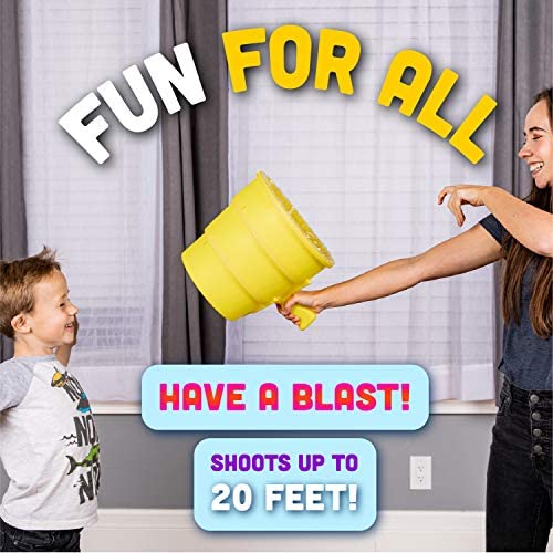 HOW IT WORKS: AirZooka is the “fun blaster” that blows a harmless ball of air up to 20 feet! Just point and shoot a ball of air and have a blast! This is the perfect indoor fun for family game night.