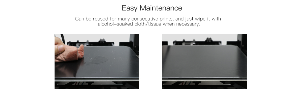 Excellent Adhesion: Covered by microporous coating, shows strong adhesion in printing. Carbon-silicone construction makes models to be popped off easily after the bed cools down.