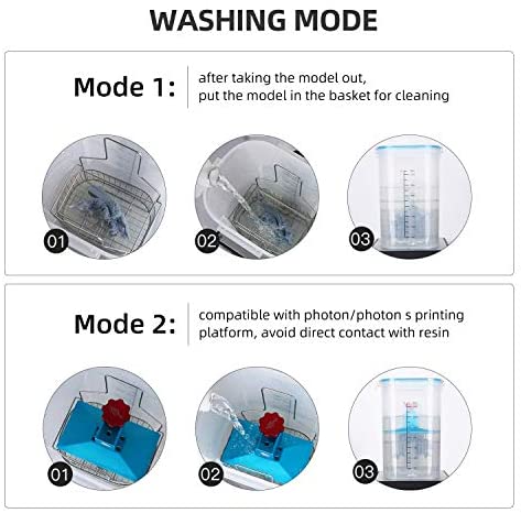 Cleaning Mode: 1. Basket cleaning: remove the model and put it into the basket for direct cleaning; 2. Hanging cleaning: directly hang the print platform on the cleaning basket or cleaning stand to clean, reducing exposure to resin. Compatible with most LCD/DLP/SLA 3D printers such as Mars series, Photon series, etc. on the market.
