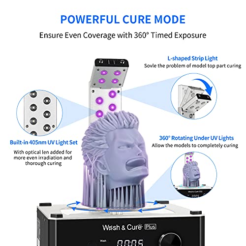 Real 360° Curing: The 360°auto-rotating curing platform, equipped with L-shape strip light and reflective mirror sticker, enables the wash and cure machine to realize a real thorough curing; Prominently, its L-shaped strip light make the top UV lamp adjustable, solving the problem of model top part curing