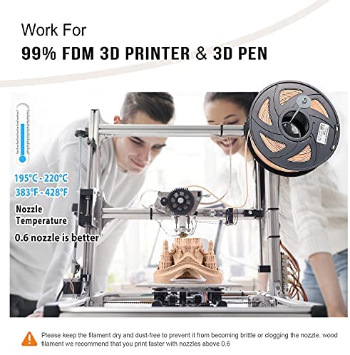 ✅【 FOR YOU】 Recommended extrusion/nozzle temperature 180°C – 210°C (356°F – 410°F), hot bed 0°C – 60°C (32℉~ 140℉) Please keep the filament dry and dust-free to prevent it from becoming brittle or clogging the nozzle. Wood Filament We Suggest that you use 0.6 nozzles to print better