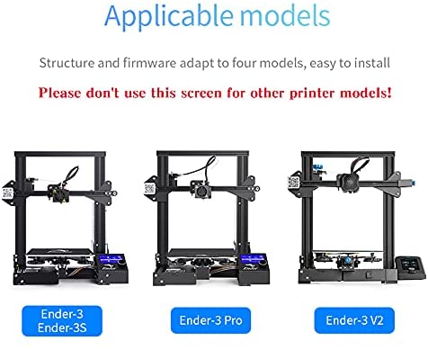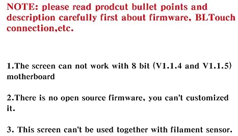 ATTENTION: The screen can not work with 8 bit (V1.1.4 and V1.1.5) motherboard, and it’s ONLY for creality ender 3, ender 3 pro, ender 3 v2 and ender 3s 3d printer. Please don’t use it for other printers. There is no open source firmware, you can’t customized it . This screen can’t be used together with filament sensor.