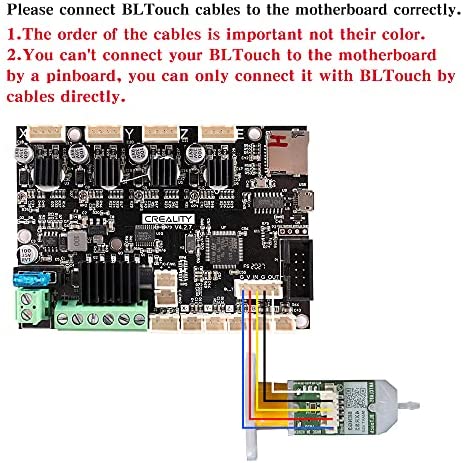 BLTouch connection: Please find the correct BLTouch cable wiring connection in product images, the order of the cable is important not their color. You can’t connect your BLTouch to the motherboard by a pinboard, you can only connect it with BLTouch by cables directly.