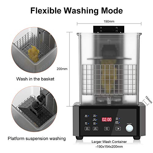 【Flexible Washing Mode,Larger Wash Container 】The model can be washed separately in the washing basket or mount the build plate with models on it and wash them together, which can avoid direct contact to uncured resin. The height of the platform bracket can be adjusted to fit the liquid level in the bucket, This equipment has the largest washing container currently on the market(190×154×200mm) which can accommodate larger size resin models for cleaning.