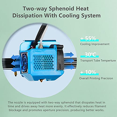 2. Dual Fans Cooling System: The nozzle is equipped with two-way sphenoid that dissipates heat in time and drives away heat more evenly. It effectively reduces filament blockage and promotes aperture precision, producing better works.