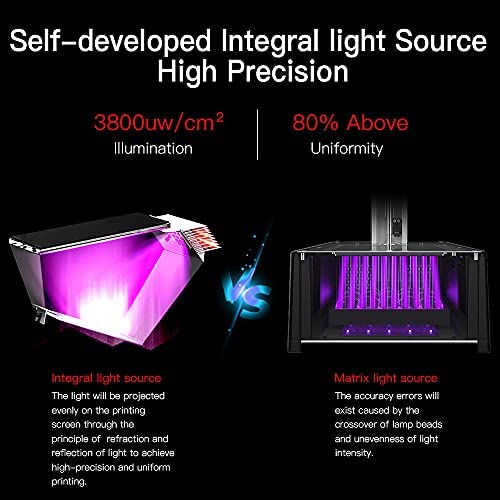 SELF-DEVELOPED INTERGRAL LIGHT SOURCE: Compared with the directional matrix light source, this Creality resin printer, with 120W 6-lamp spotlight, adopts has the absolute advantages of 20% higher precision, 15% higher uniformity and 99% higher saturation, which perfectly solves the problems such as uneven light curing, overexposure as well as corrugated layer on the printed models.