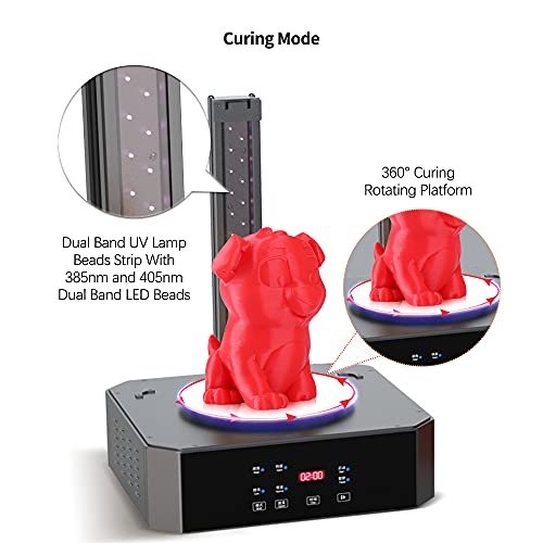360° All-around Curing: 360° specular reflection rotary curing platform with 385nm and 405nm dual-band LED beads, all-round curing without dead band.