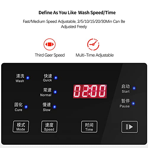 Largest Wash Cure Machine: UW-02 has a large washing volume of 9.44″ x 6.29″ x 7.87″ and curing volume of 7.87″ x 11.81″, so you can wash cure models printed by large resin printers such as Halot-sky, which can dramatically simplify messy post-processing.
