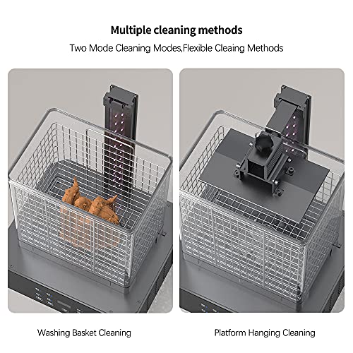Two Washing Modes: Basket washing, remove the model and put it into the basket for direct cleaning; Platform hanging washing, directly hang the print platform on the basket or cleaning stand to clean, reducing exposure to resin.