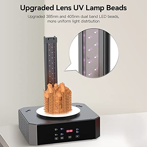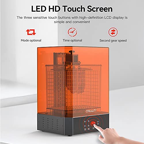 Washing and Curing 2 in 1: The 2 in 1 design enables the washing and curing of 3D printing models in one machine. UW-02 is a professional solution that can save you time and make washing and curing more efficient. It has two speeds- Fast/Medium, and the time of 2-30min can be adjusted freely. The three sensitive touch buttons with high-definition LCD display is simple and convenient.