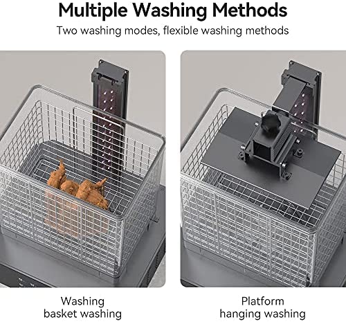 Multiple Washing Methods: The washing and curing station has two washing methods: 1. Basket Type Cleaning- Remove the model and put it in the basket for direct cleaning; 2. Platform Suspension Cleaning- Directly hung on the platform frame to reduce contact with resin. The large magnetic fan blades enable a super large vortex and high speed washing which can powerfully remove excess resin on the surface of the models.