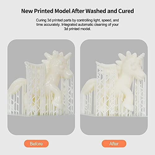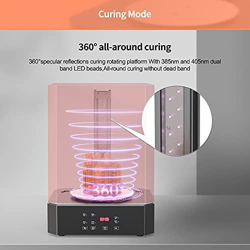 360° Curing – With 360° specular reflections curing rotating platform realize all-round curing. Upgrade the 385nm and 405nm dual-band UV lamp beads strip, increase entire lens strip to make the UV light source irradiation is the more uniform and concentrated and more complete model curing. Compatibility with many resins.