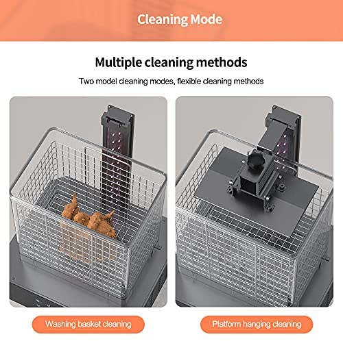 Powerful Washing – Customized magnetic large fan blade, Super large vortex high-speed cleaning, strong removal of excess resin on the surface of the model. 2 modes of Cleaning: 1. Basket washing, Remove the model and put it into the basket for direct cleaning; 2. Platform hanging washing, Directly hang the print platform on the basket or cleaning stand to clean, reducing exposure to resin. Larger size washing bucket that can accommodate larger size model for cleaning.