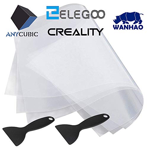 These FEP sheets of thin clear Teflon film are used in a variety of UV SLA printers. This package also includes two complimentary plastic replacement spatulas for use with these FEP sheets to prevent unnecessary damage. Over time they can become scratched, deformed, stained, or otherwise damaged through typical prolonged use of the machine. After as few as 40 hours of printing, replacing the FEP film on your printer can lead to higher success rates and better print overall quality. This package comes with 4 sheets of 230mmx180mmx0.15mm FEP film which is suitable for ELEGOO Mars/ Longer Orange, AnyCubic Photon/ Photon S, Creality LD-001, EPAX X1 and Wanhao Duplicator 7 SLA printers.