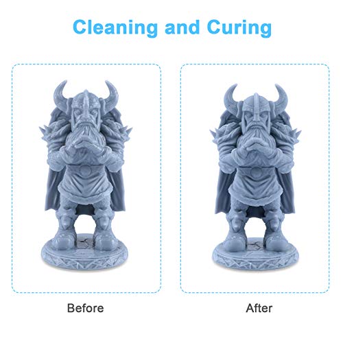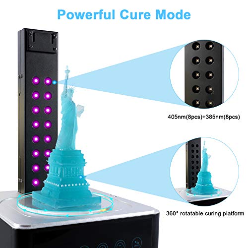 Simple and Efficient Curing Control:Built-in 8pcs 405nm and 8pcs 385nm UV LED beads, work together with the 360° rotatable curing platform, which can cure the models evenly. LCD screen and touch button can visually display and set cleaning and curing time.