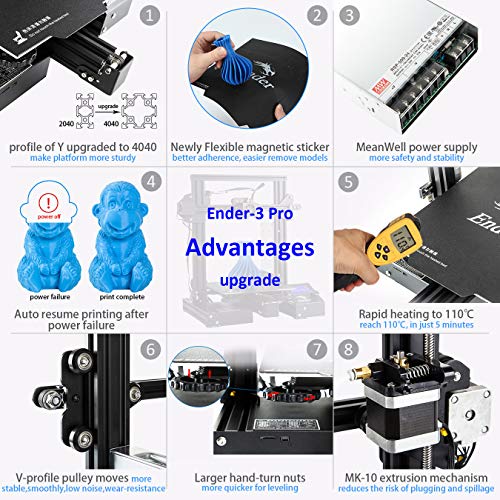 2.Meanwell Power supply: safty protected, with UL Certified, protecting your printer from unexpected power surges, that can rapid heat the hotbed to 110℃ in just 5 minutes. Making the Ender 3 Pro suitable for many different types of filaments.