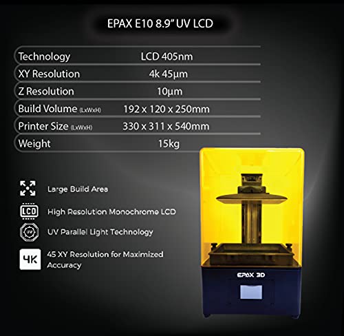 【Warranty and Service】EPAX provides a 1-year USA warranty on the whole printer (LCD screen, nFEP film, and tool kit excluded). USA based Support Center offers you quality and fast customer service. All EPAX printers are built to last and mod/upgrade friendly. This E10 can easily be upgraded to 10.1″ 5K screen with the screen and a new mainboard. Everything else are built with 10.1″ size in mind. 10.1″ Parallel light source. 10.1″ vat. 10.1″ build plate.