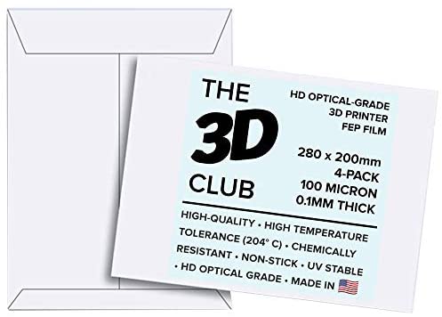 The 3D Club is focused on making the highest-quality 3D printing equipment and accessories on the market at an affordable price. As 3D printing enthusiasts ourselves, we’re happy to sacrifice short-term profits in order to push the community forward. Our FEP sheets are professionally produced to maximize optical clarity and rigorously tested to reduce production errors. Our FEP sheets come in 0.05mm, 0.1mm, 0.15mm and 0.2mm thickness and come in a A4 size sheets (8″ x 11″, 280mm x 200mm). Each order includes 4 sheets packaged in a plastic resealable bag. All sheets are separated with a piece of paper for easy handling. Use 70-90% isopropyl alcohol when cleaning the vat and a microfiber cloth to clean the film itself. The FEP sheets are compatible with most 3D printer models.