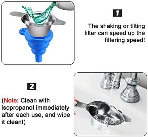 Our filter is made of stainless steel and is rust-proof. Compared with other products, we use a larger filter and strengthen the handle to make it more durable. The foldable funnel is made of high-quality organic silicon material, which is environmentally friendly, soft, wear-resistant, and can be used for a long time.