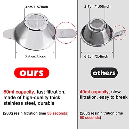 【Two kinds of filters 】– The kit includes mesh filter and porous filters.The mesh filter has a faster filtration speed and saves time (200g resin filtration time is 55 seconds, and other filters on the market are 90 seconds); the porous filter is easy to clean and durable. The filter and the two-way handle are made of high-quality thick stainless steel, which is firm, not easy to deform, and more convenient to operate.