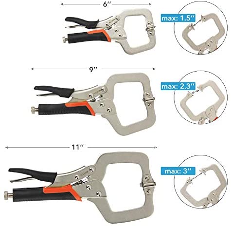 Made from nickel plated alloy steel to withstand corrosive working environment, Screw adjustable locks with trigger release.3.25” Opening capacity jaws, Clamp wood joints and auto body panels while avoid damaging.C-Clamp is the perfect tool to clasp any material whatever their shape or size. Its 11-inch locking feature is a reliable choice for home or workshop projects. Its compact design is also great for toolkits for the traveling craftsman