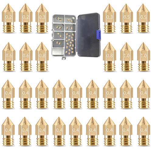 MK8 Extruder Nozzles Kit for 3D Printer: Total 30pcs, 7 sizes of printing head. 2 x 0.2mm, 2 x 0.3mm, 18 x 0.4mm, 2 x 0.5mm, 2 x 0.6mm, 2 x 0.8mm, 2 x 1.0mm. All nozzles are sorted in the partition storage box with adjustable space, no need wasting time to sort out the size of print heads you want.