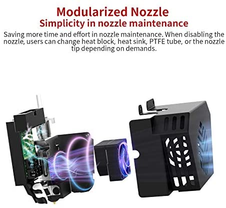 Modularized Nozzle: Creality CR-6 SE 3D printer includes a modularized nozzle for easy nozzle maintenance and tinkering, and allows users to replace and substitute each single components like heat sink, heat block, PTFE tube and hotend easily. A set of powerful cooling fans enables superior control over filament extrusion and retraction. The hotend also houses an filament runout sensor to pause prints when required.