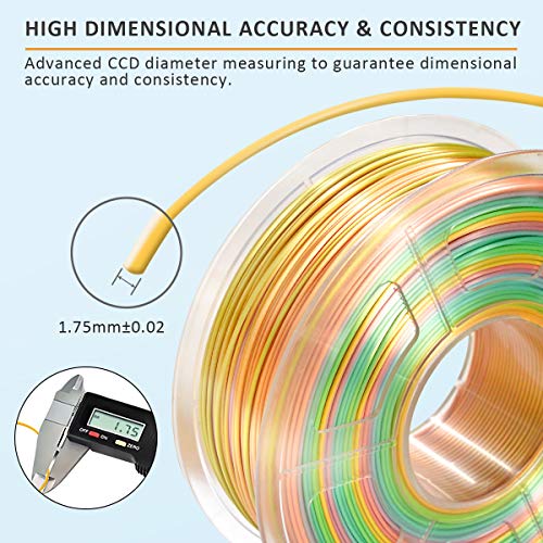 【Dimensional Accuracy & Consistency】These Silk Rainbow PLA filaments to be strict tolerances. Diameter 1.75mm, dimensional accuracy + / – 0.02 mm without any exaggeration; 1 kg spool (2.2lbs)