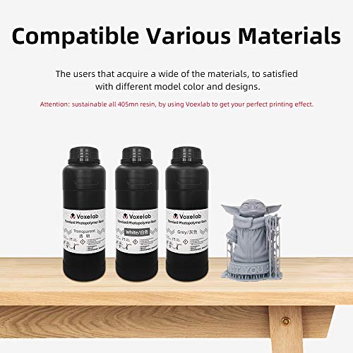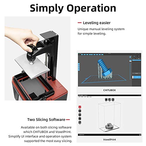 【Easy to use】Fully assembled, Out of box, leveling was a breeze. The package does not include 3d printer resin, but it supports resins of 405nm. We recommend Voxelab official resins, much cheaper and very stable
